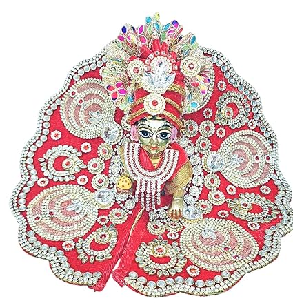 Adorn your Laddu Gopal ji with this exquisite handmade red poshak, featuring intricate kundan and stone work. Comes complete with a matching pagadi and mala, perfect for festivals and daily darshan.