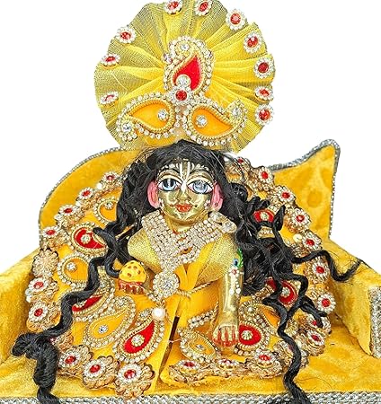 Celebrate Janmashtami with elegance and devotion! This handcrafted yellow dress from the Premanjali collection is adorned with sparkling zircon stones and traditional Kolkata-style artistry. Designed especially for your Laddu Gopal, this divine outfit includes a beautifully matching pagdi, making it perfect for the auspicious occasion.