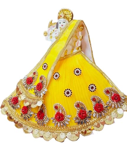 Adorn your idol with divine elegance this Navratri! Featuring a traditional lehenga, patka & chunari set in vibrant yellow with diamond studs and patch work.