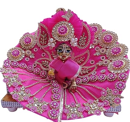 Celebrate devotion with this exquisite handmade pink poshak from the Premanjali collection, featuring traditional Kolkata craftsmanship and sparkling zircon studs. This beautiful dress is designed to enhance the divine look of your Laddu Gopal, complete with a matching pagdi and maala for the perfect festive ensemble.