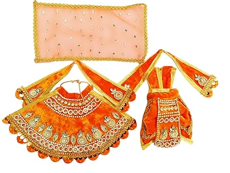 Adorn your beloved idols with this beautifully crafted vastra set, featuring a lehenga and dhoti paired with a matching chunri. This export-quality attire adds a traditional and festive touch to your puja decor.