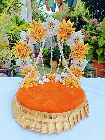 Celebrate the joyous occasion of Janmashtami with this vibrant singhasan designed especially for Laddu Gopal. Featuring bright orange and white colors, this singhasan adds a festive and elegant touch to your pooja mandir. Sized at 10 inches by 8 inches, it’s perfect for adorning your Bal Gopal during Janmashtami sringar.